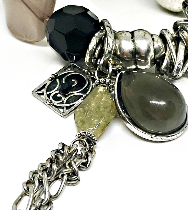 Bracelet à breloques, pampilles en aluminium et métal argent perles noires et charms - élastique pour Femme - MILA