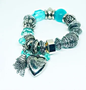 Bracelet à breloques, pampilles en aluminium perles Turquoise et Coeur - charms - élastique pour Femme - DEESSE