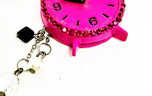 Bijou de Sac réveil fuchsia en métal argent ou pour porte clés - à Pampilles rouge - à Breloques Charms et strass roses - CLOCK